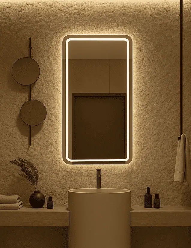 Kolekcja ARK line to eleganckie lustro LED o prostokątnym kształcie z subtelnie zaoblonymi rogami, zaprojektowane z myślą o nowoczesnych i ponadczasowych wnętrzach. Delikatna linia światła tworzy nastrojową poświatę, która podkreśla fakturę ściany i nadaje przestrzeni wyjątkowej głębi.
